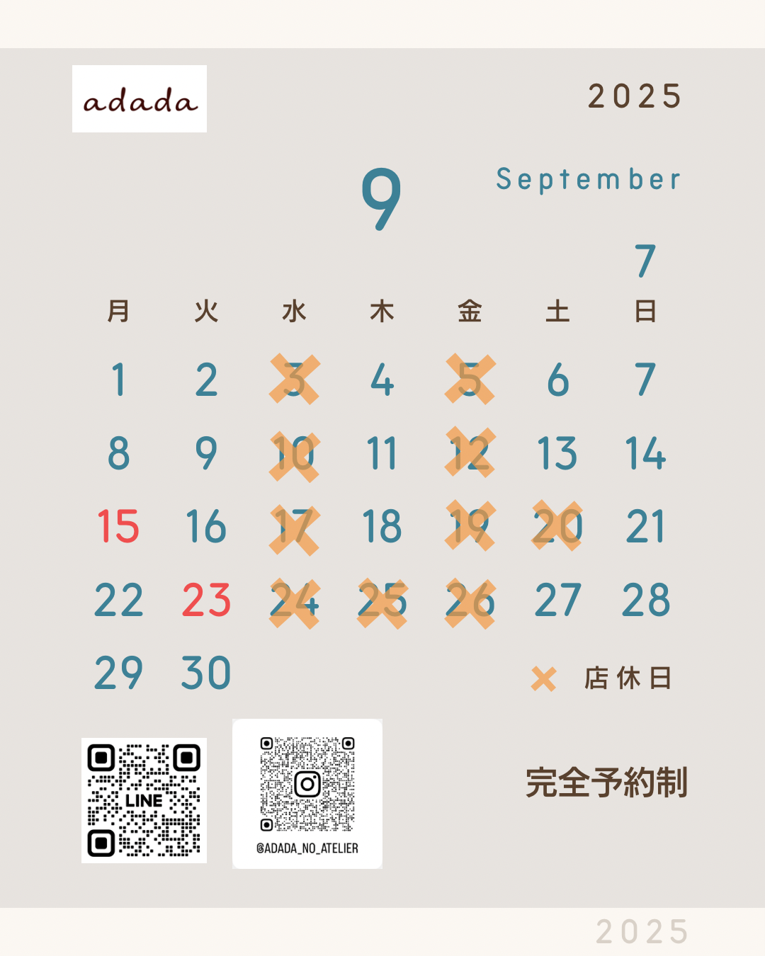 水曜定休(金曜日は都内サロンワークのためclose)不定休あり